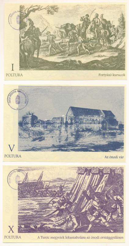2007. Ónod I Poltura + V Poltura + X Poltura, mind sorszám nélkül, mindegyik előlapján "Az 1707. évi ónodi országgyűlés 300. évfordulója" felülbélyegzéssel, mindegyik hátlapján "Ónod Község Önkormányzata" felülbélyegzéssel T:UNC,AU