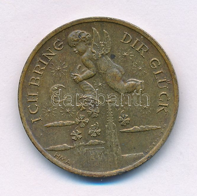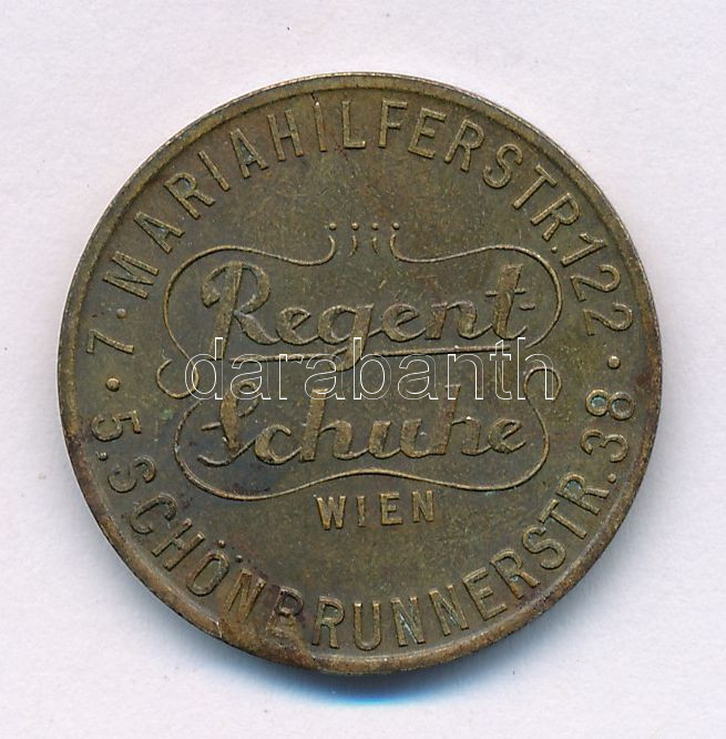 Austria cca 1900. "Regent Schuhe Wien - 7. Mariahilferstr. 122. - 5. Schönbrunnerstr. 38. / Ich bring dir Glück (Regent Shoe Store Vienna - 7. district, Mariahilferstr. 122 - 5. district, Schönbrunnerstr. 38 / I bring you luck)" bronze advertising token (23mm) C:XF