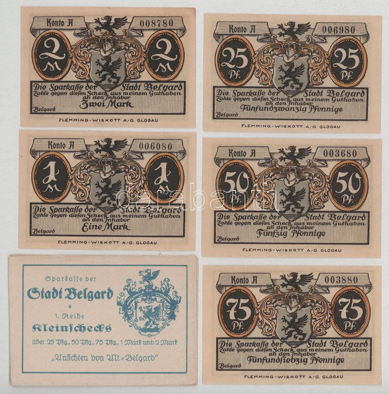 German Empire / Weimar Republic / Belgard (Bialogard) ~1920. 25 Pfennig + 50 Pfennig + 75 Pfennig + 1 Mark + 2 Mark (5xdiff), full serie, with original envelope C:AU