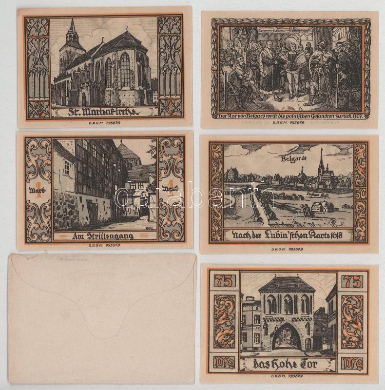 Német Birodalom / Weimari Köztársaság / Belgard (Bialogard) 1920 k. 25Pf + 50Pf + 75Pf + 1M + 2M (5xklf), teljes sor, eredeti borítékkal T:AU