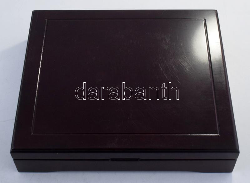 Mahagóni fa érmetartó kazetta bársonybéléssel, 1db beépített + 2db kivehető tálcával, összesen 24db ~46mm-es és 1db ~207x148mm-es férőhellyel. Használt, de jó állapotban (külső méretek: ~305x268x65mm)