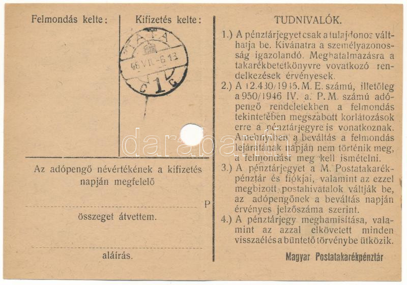 1946. 100.000AP nem kamatozó Pénztárjegy "B * 053851" "Másra át nem ruházható", "M. Kir. Posta Takarékpénztár - Főpénztár" bélyegzéssel, hátoldalon "TATA" bélyegzéssel, lyukasztással érvénytelenítve T:F