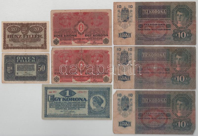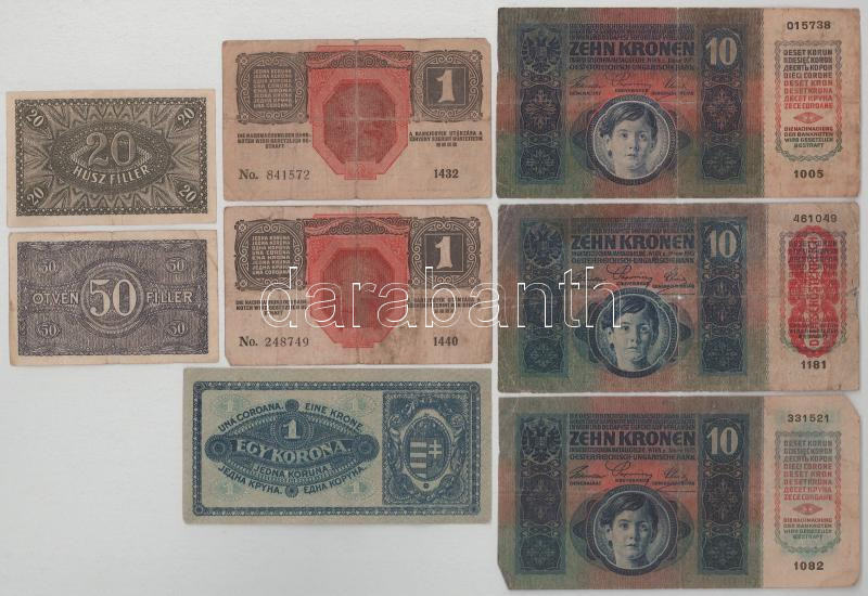 Vegyes 8db-os korona és fillér bankjegytétel, benne: 1915. 10K (3x) + 1916. 1K (2x) + 1920. 1K + 50f + 20f T:F-VG