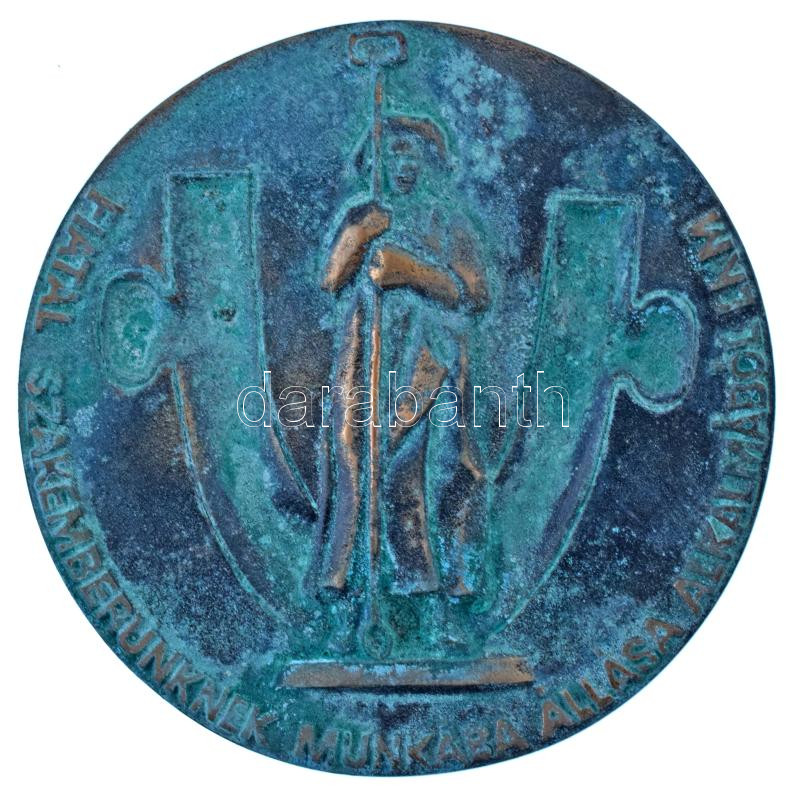 1970 k. Lenin Kohászati Művek "Fiatal szakemberünknek munkába állása alkalmából - LKM" egyoldalas, öntött bronz emlékérem, hátlapján műbőr anyag darabbal, ami elkezdett leválni (114mm) T:XF, patina
