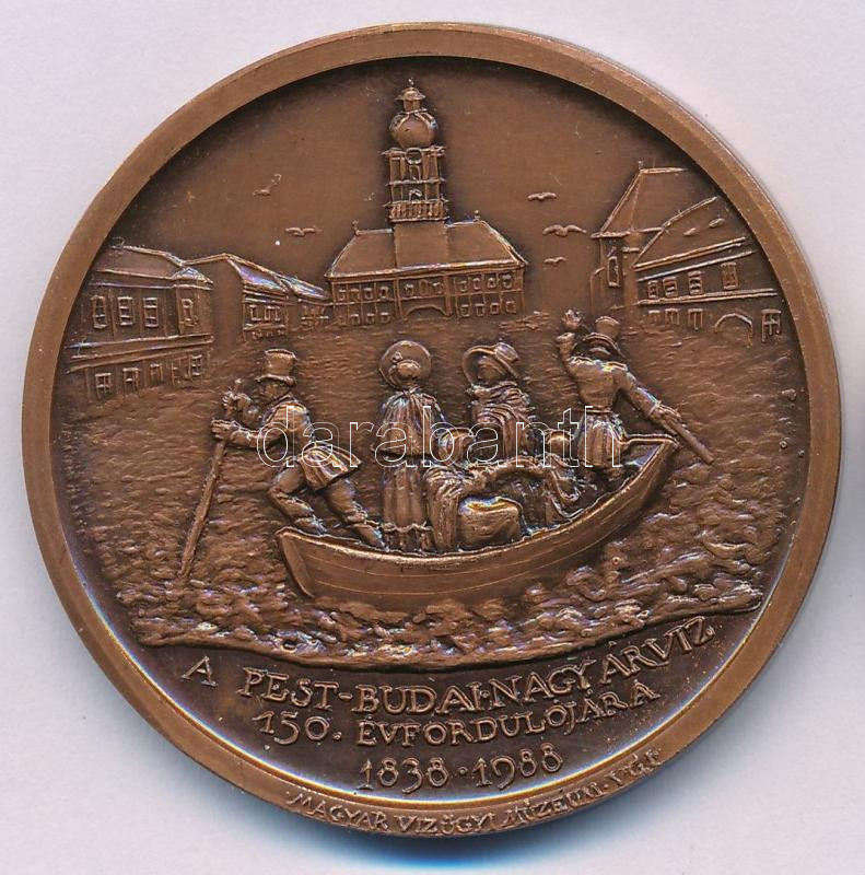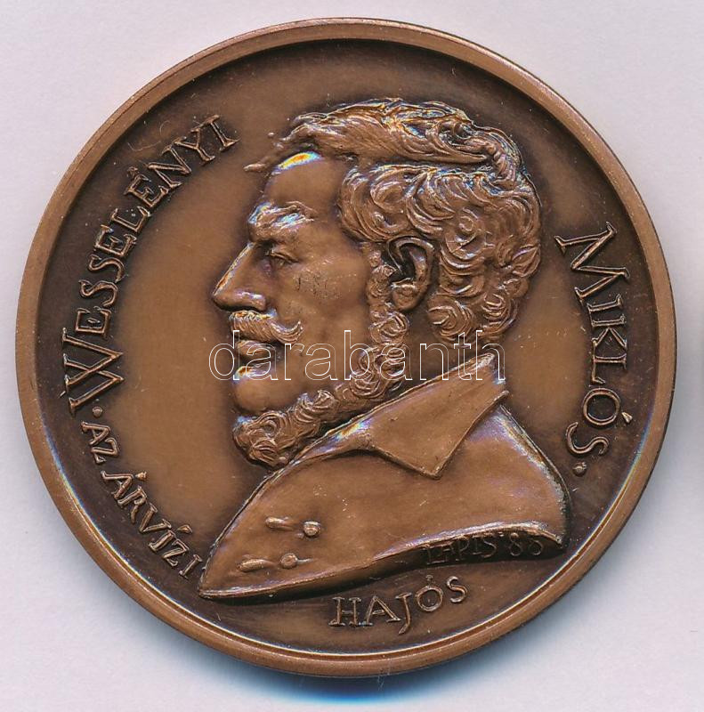 Lapis András (1942-) 1988. "Wesselényi Miklós, az árvízi hajós / A pest-budai nagy árvíz 150. évfordulójára 1838-1988 - Magyar Vízügyi Múzeum, VGI" kétoldalas bronz emlékérem (42,5mm) T:AU patina