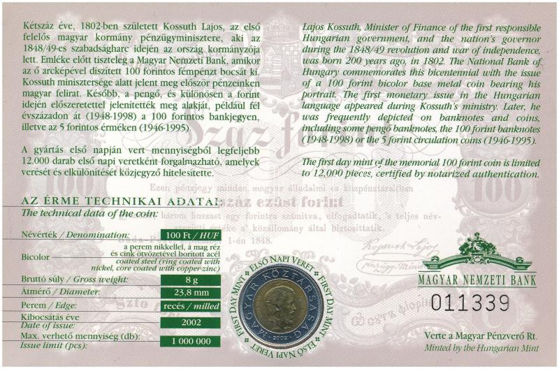 2002. 100Ft "Kossuth Lajos" elsőnapi veret, díszlapon "011339" T:UNC