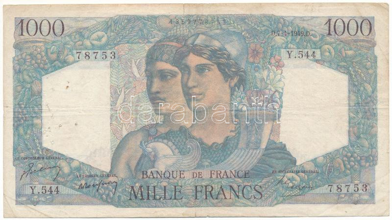 France 1949. 1000 Francs C:F pinholes, small tear