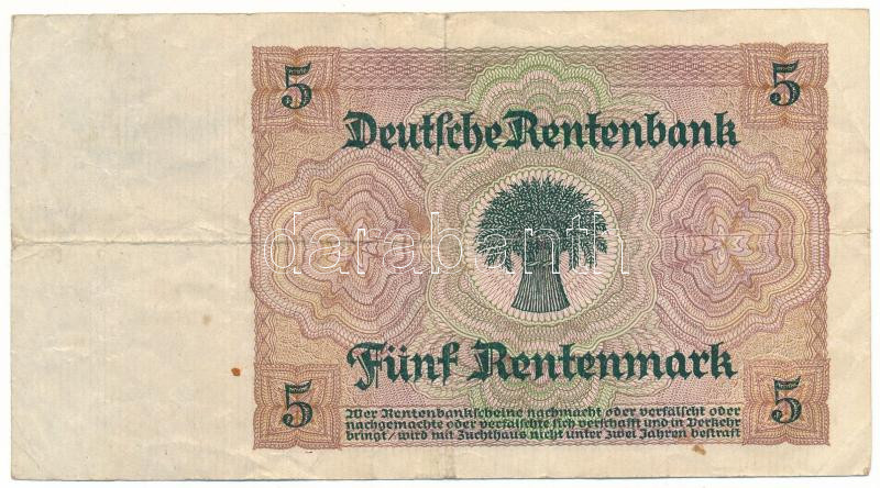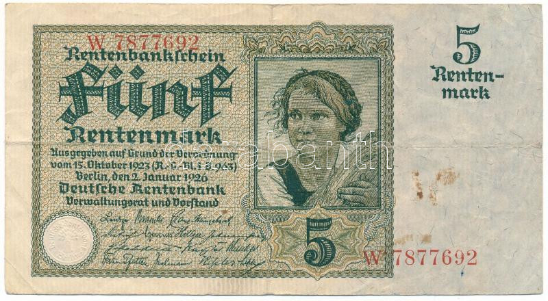 Germany / Weimar Republic 1926. 5 Rentenmark "W 7877692" C:F
