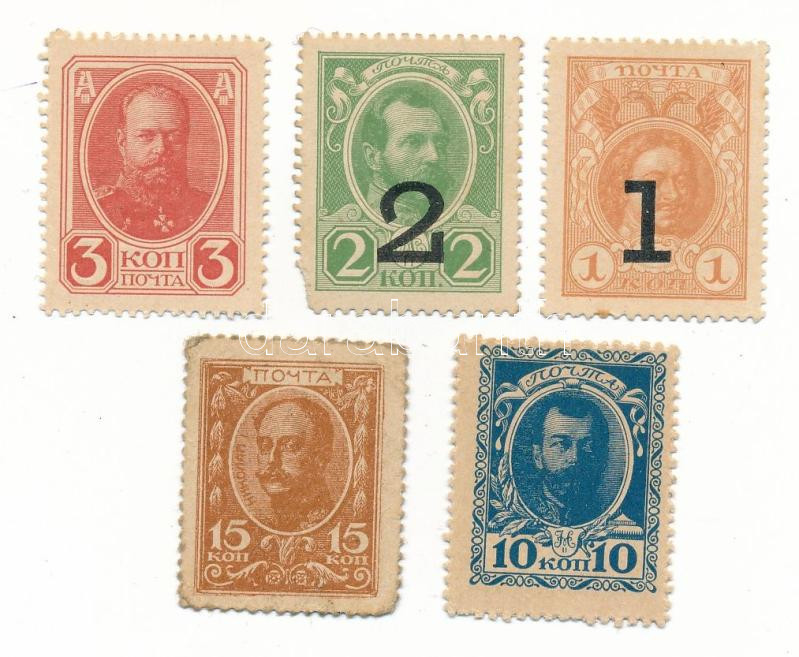 Orosz Birodalom 1915. 1k "1" felülbélyegzéssel + 2k "2" felülbélyegzéssel + 3k + 10k + 15k (5db) T:AU-F