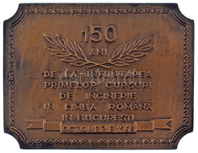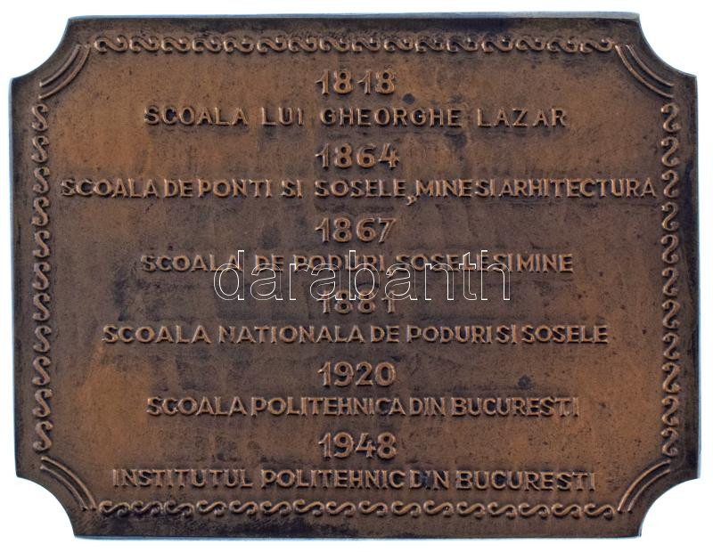 Románia 1968. "Az első bukaresti román nyelvű mérnöki tanfolyam 150. évfordulója" kétoldalas bronz emlékplakett. "150 ani de la infiintarea primelor cursuri de inginerie in limba română in Bucuresti octombrie 1968 / 1818. Scoala Gheorghe Lazar - 1864. Scoala de Ponti si Sosele, Mine si Arhitectura - 1867. Scoala de Poduri, Sosele si Mine - 1881. Scoala Nationala de Poduri si Sosele - 1920. Scoala Politehnica din Bucuresti - 1948. Institutul Politehnic din Bucuresti (150 éve alapították az első román nyelvű mérnöki képzéseket Bukarestben, 1968 októberében / 1818. Gheorghe Lazar Iskolája - 1864. Híd- és Útépítő, Bányászati és Építészeti Iskola - 1867. Híd-, Út- és Bányászati Iskola - 1881. Nemzeti Híd- és Útépítő Iskola - 1920. Bukaresti Műszaki Iskola - 1948. Bukaresti Műszaki Intézet) (87x66mm) T:AU