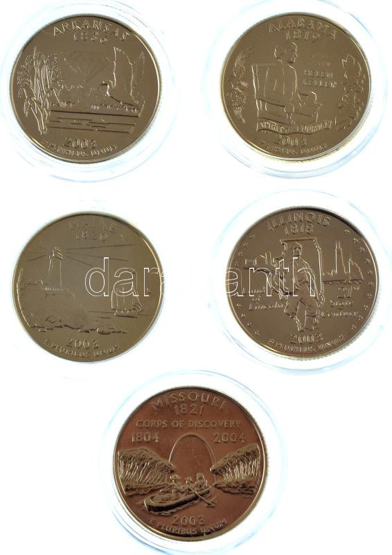 Amerikai Egyesült Államok 2003. 1/4$ "50 állam" sorozat 5xklf darabja (Illinois, Alabama, Maine, Missouri, Arkansas), mind aranyozott és kapszulában T:AU