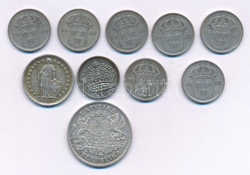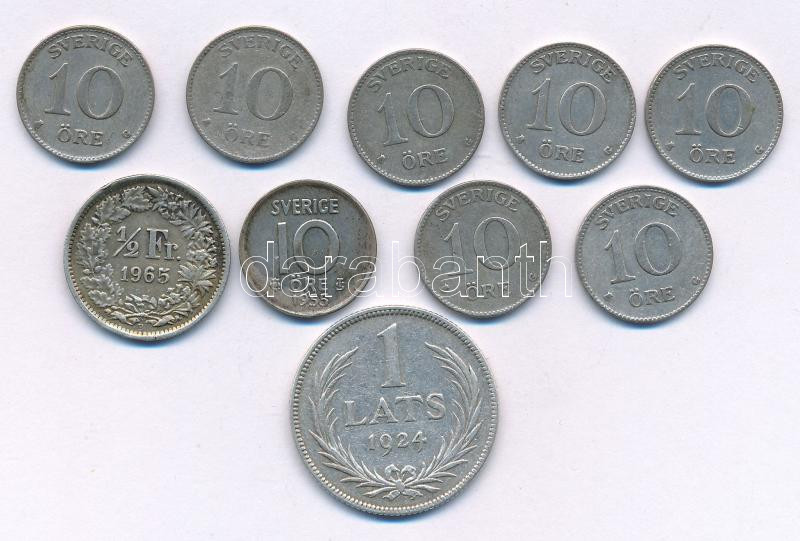 Vegyes, 10db-os érmetétel, közte: Svédország 1937-1955. 10ö Ag (8db) + Svájc 1965. 1/2Fr Ag + Litvánia 1924. 1L Ag T:XF-VF