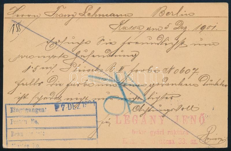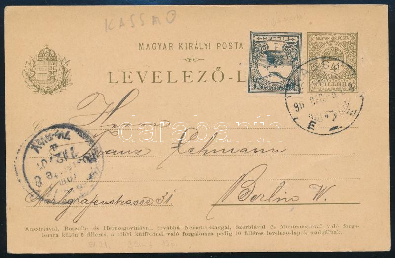 1901 Díjjegyes levelezőlap Turul 1f kiegészítéssel "KASSA" - Berlin