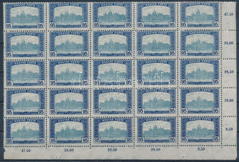 1919 Magyar Posta 95f ívsarki 25-ös tömb alul téves összegzési számokkal, elfogazva