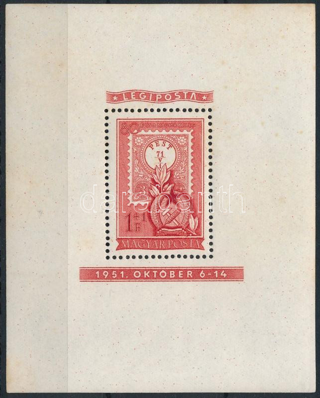 1951 80 éves a magyar bélyeg 1Ft blokk (17.000) (rozsdafoltok / stain spots)