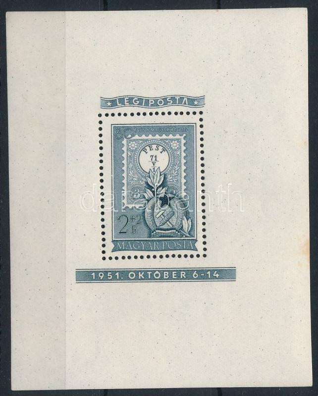1951 80 éves a magyar bélyeg 2Ft blokk (17.000) (rozsdafoltok / stain spots)