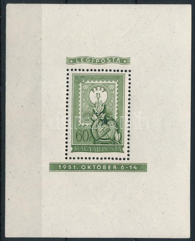 1951 80 éves a magyar bélyeg 60f blokk (17.000) (betapadás / gum disturbance)