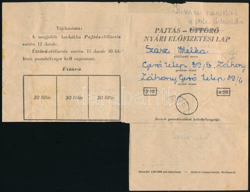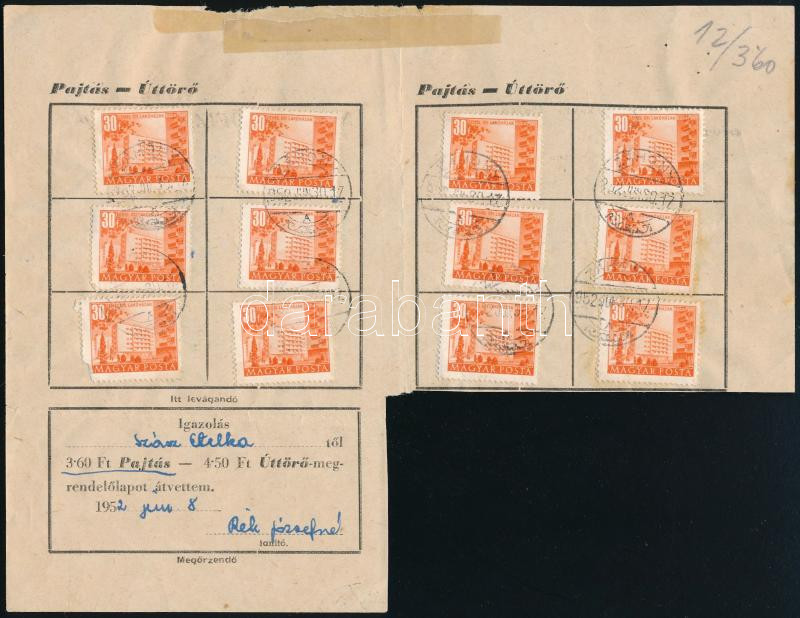 1952 Pajtás előfizetési lap 12 db Épületek bélyeggel / Pioneer periodical subscription form with 12 stamps