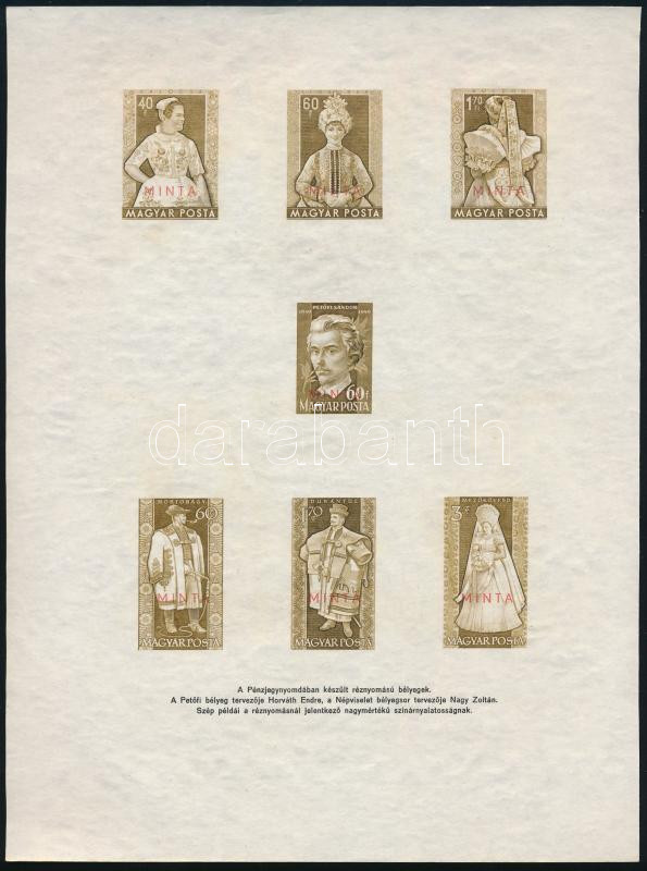 ~1953 Népviseletek 2 klf sor 3-3 értéke + Petőfi 60f az eredeti nyomóeszközökkel készült nyomdai mintán, a kiadottól eltérő színekben, a Pénzjegynyomda gumi és vízjel nélküli papírján