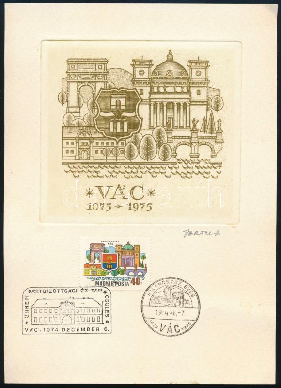 1974 900 éves Vác rézkarc emléklap a tervező, Vertel József aláírásával