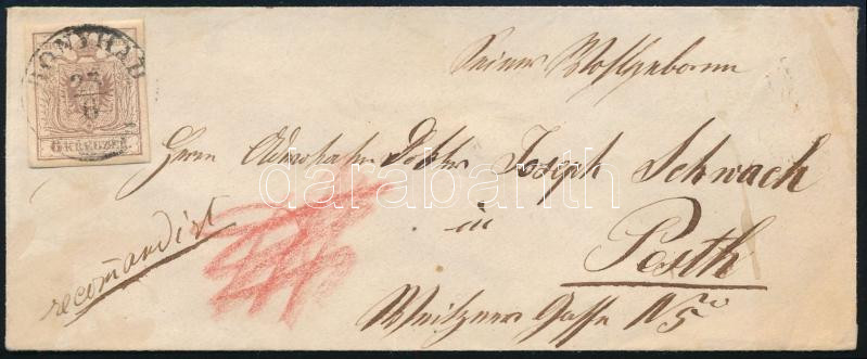~1853 6kr HP III világos barna bélyeg levélen, "BONYHÁD" - "PESTH"