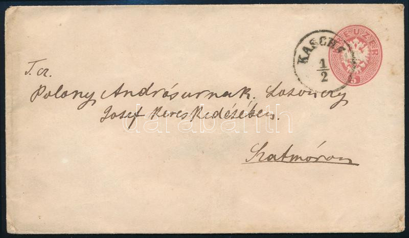 ~1863 5kr díjjegyes boríték "KASCHA(U)" - "SZATHMÁR" (9.000)