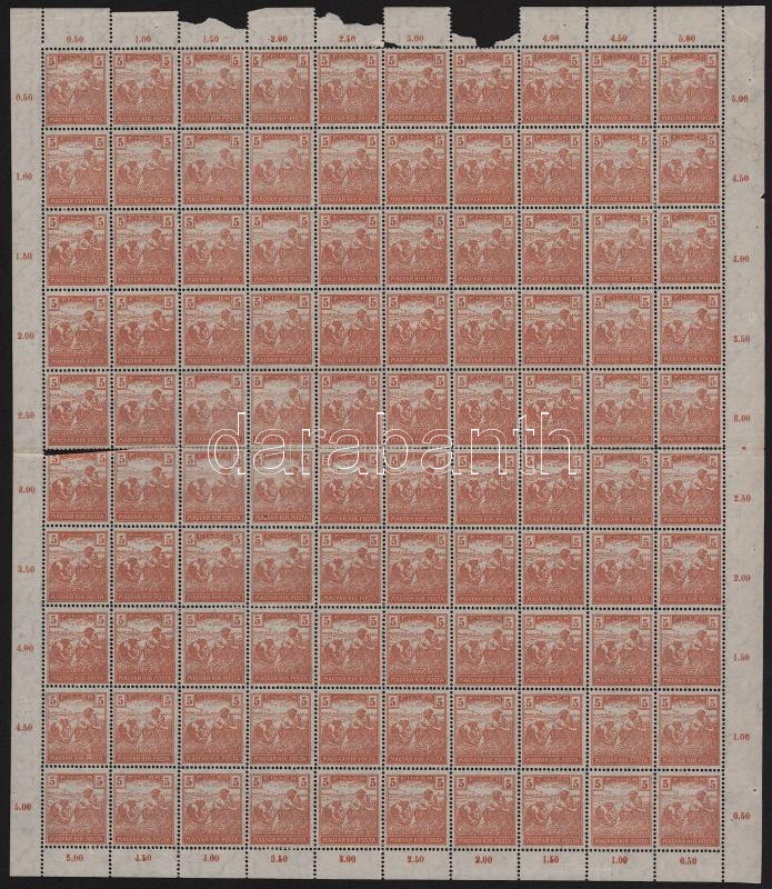 1920 Arató 5f hajtott teljes ívben (10.000) (csak az ívszél tartja össze, felül hiányos ívszél / aparted perfs., missing margin)