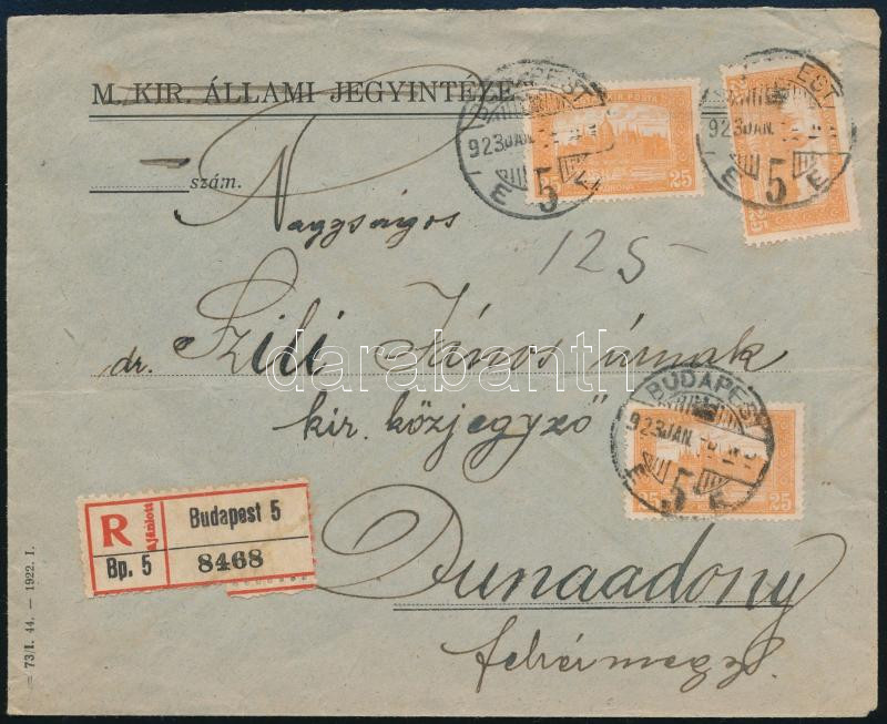 1923 Ajánlott levél 3 x 25f bérmentesítéssel Dunaadonyba