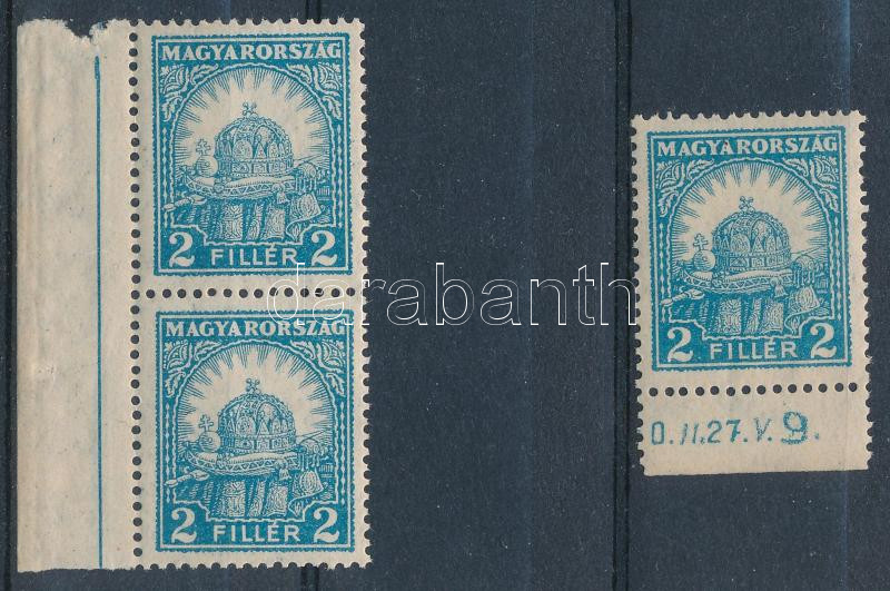 1926 Pengő-fillér (I.) 2f + 2f ívszéli pár 14 : 14 1/4 fogazással (20.000) (a szóló bélyeg falcos / one stamp is hinged)