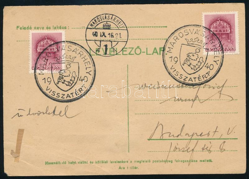 1940 Levelezőlap "MAROSVÁSÁRHELY VISSZATÉRT" bélyegzéssel