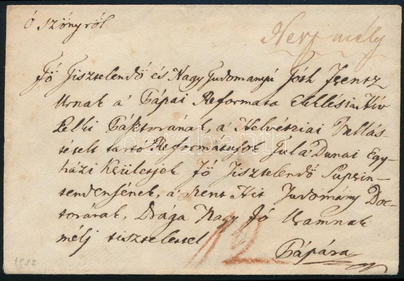 1832 Portós levél kézírásos "Neszmély" helységnévvel Pápára küldve