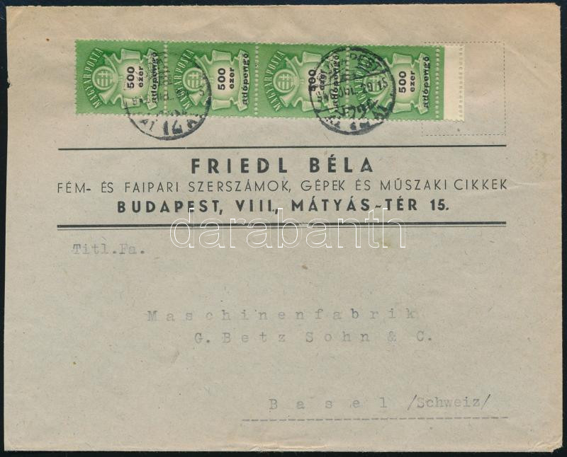 1946 (27. díjszabás) Svájcba küldött levél Budapestről 500 ezer AP ívszéli négyescsíkkal, alul kettős fogazással. Túlbérmentesített levél! Ritka!