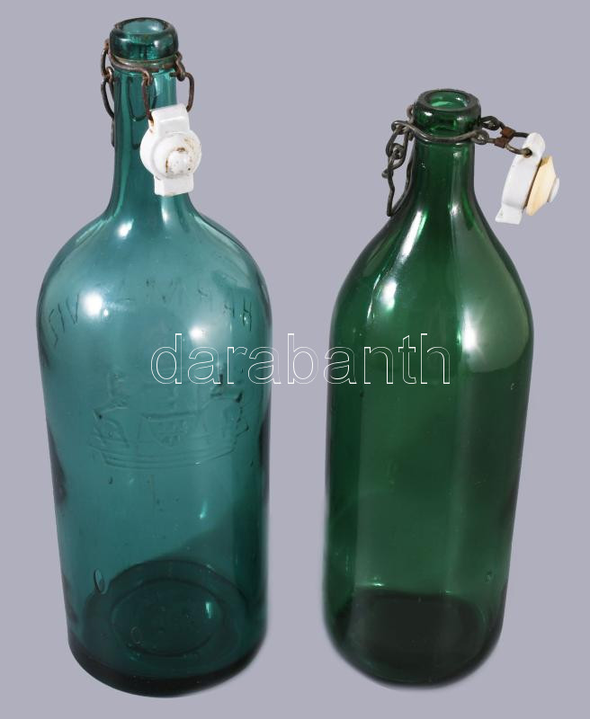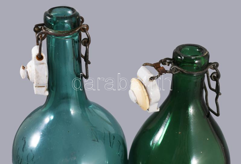 2 darab zöld csatos üveg, közte Harmatvíz, m: 35 cm alatt