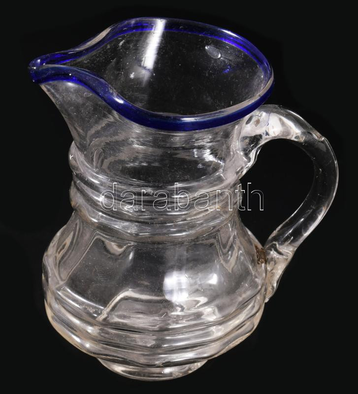Kancsó. Erdély, 19. sz. közepe - második fele, kék üvegszál peremezéssel, pattanással, m: 10 cm