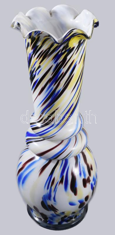 cca 1960 murano anyagában multicolor színezésű kétrétegű tejüveg fodros váza, hibátlan, m: 37 cm