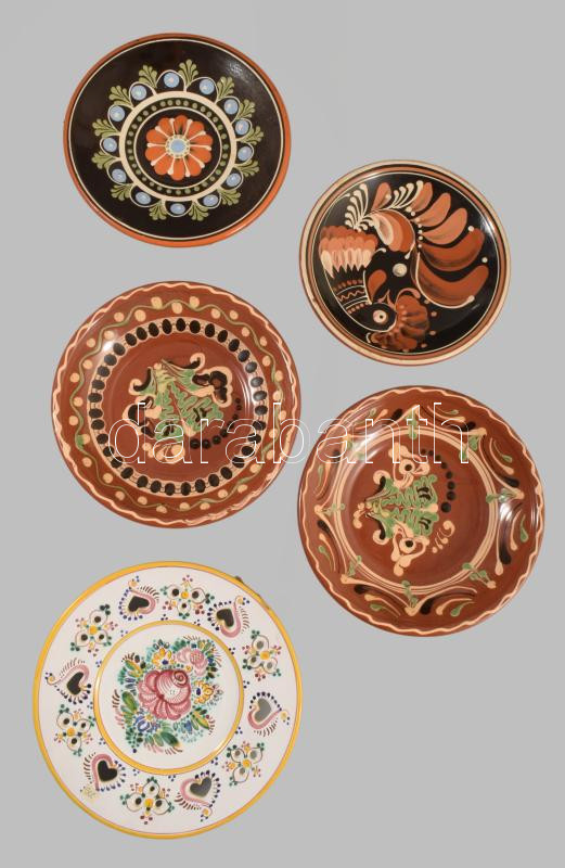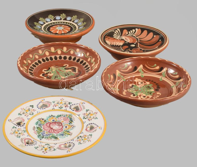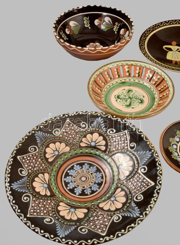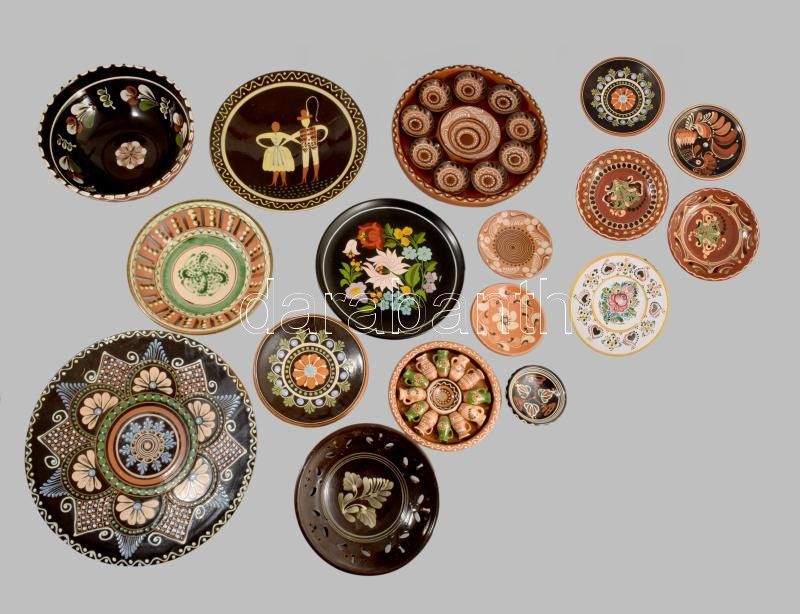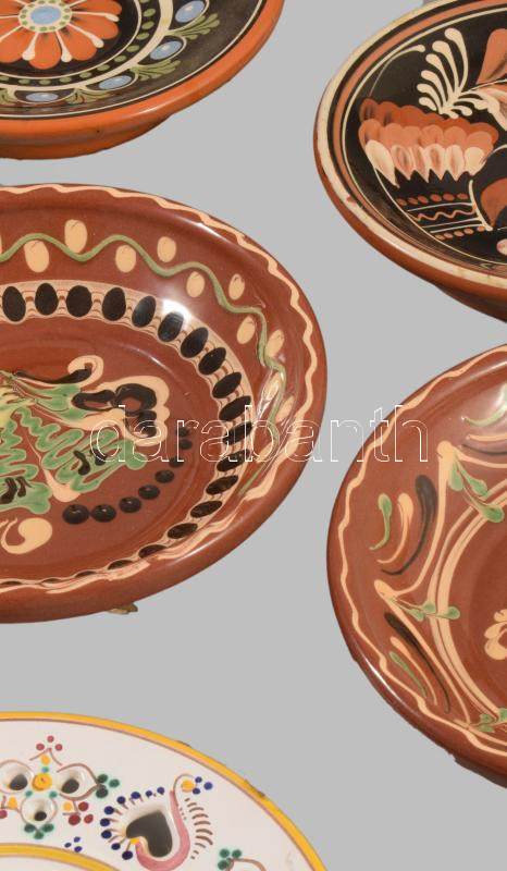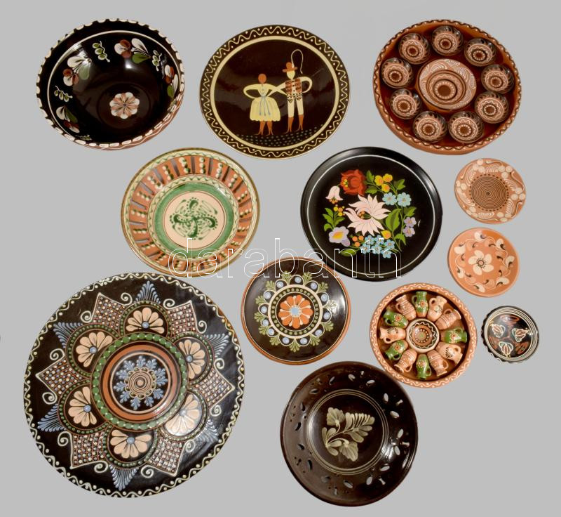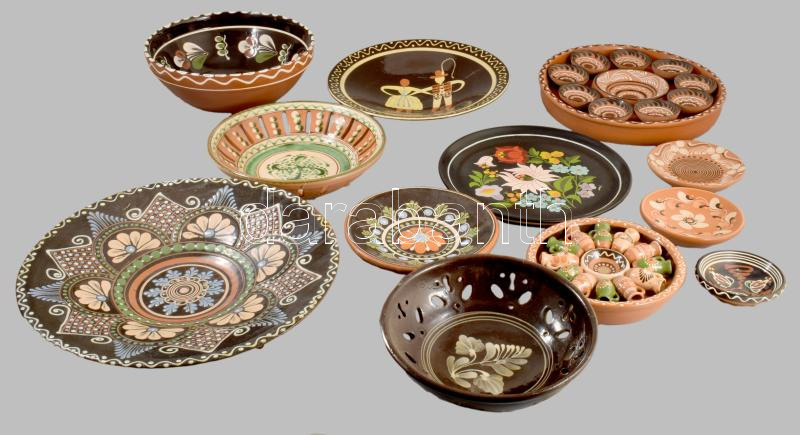 Banános doboznyi népi kerámia tárgy, közte nagyobb méretű falitálakkal.