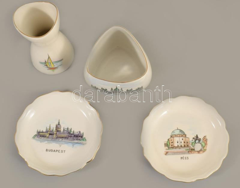 Aquincum 4 darab szuvenír tárgy, magyar mintákkal, Balaton, Pécs, Parlament, jelzett, m: 9 cm alatt