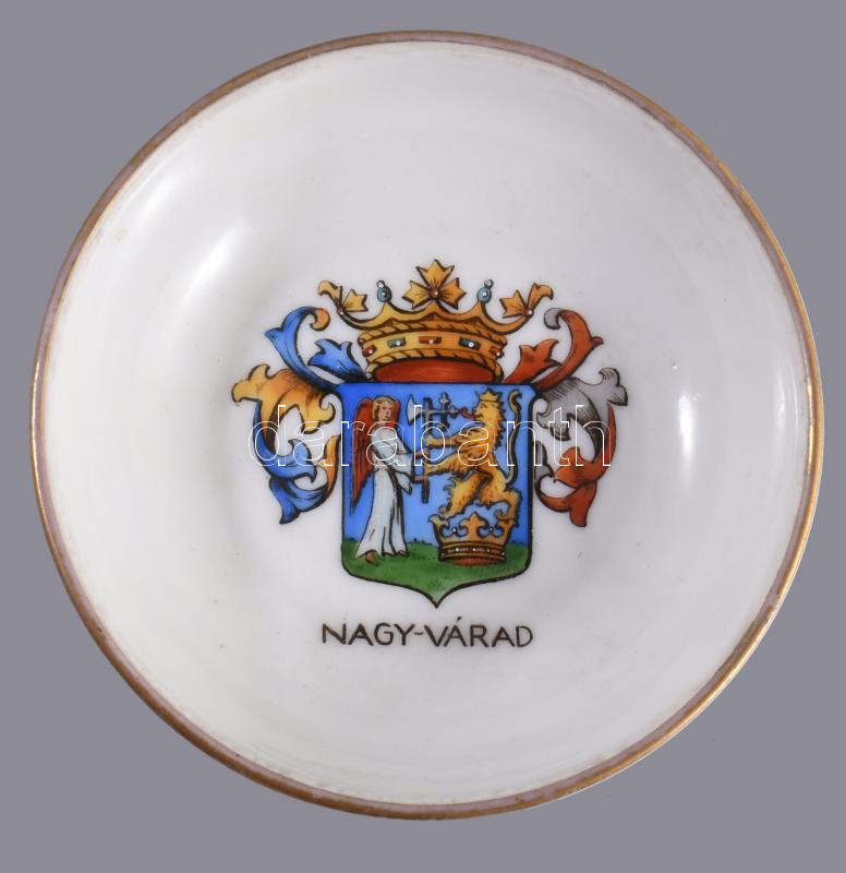 Herend Nagy-Várad címeres tálka, jelzett, kézzel festett, aranyozáson kopással, d: 8 cm