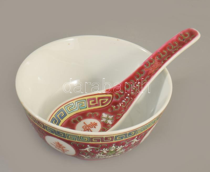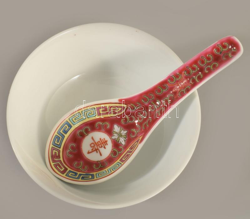 Jelzett kínai leveses csésze kanállal, hibátlan, d: 11,5 cm