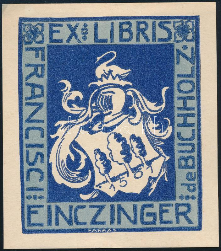 Einczinger Ferenc (1879-1950), Farkas Dezső (1905-): Ex libris Francisci Einczinger de Buchholz (címeres könyvjegy). Linómetszet, papír. Jelzett a metszeten. 9x7,5 cm
