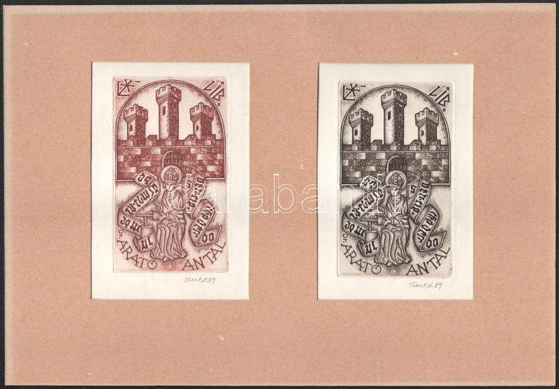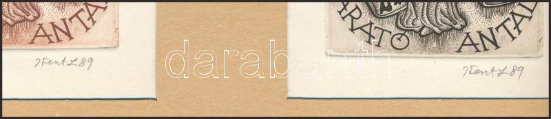 Feszt László, ifj. (1957- ): 2 db ex libris Arató Antal, 1989 (egy paszpartuban). Rézkarc, papír, mindkettő jelzett, 10,5×6 cm