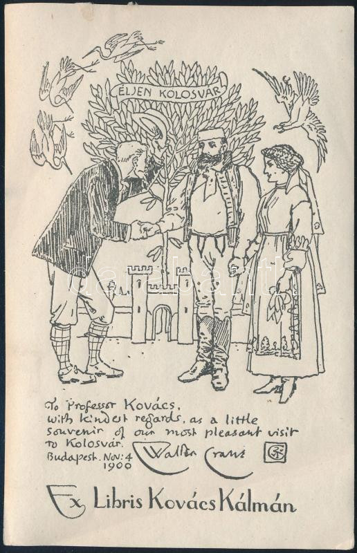 Jelzés nélkül: Ex libris Kovács Kálmán, klisé, papÃr, jelzett a klisén. Kovács Kálmán (1883-1951) tanár, tanügyi fÅ‘tanácsos ex librise, apja, Kovács János (1846-1905) unitárius tanÃtó, kollégiumi igazgató és Walter Crane (1845-1915) angol festÅ‘ kolozsvári találkozását megörökÃtÅ‘ Crane-tollrajz alapján. Lap alján hajtásnyommal. 11,5×7,5 cm