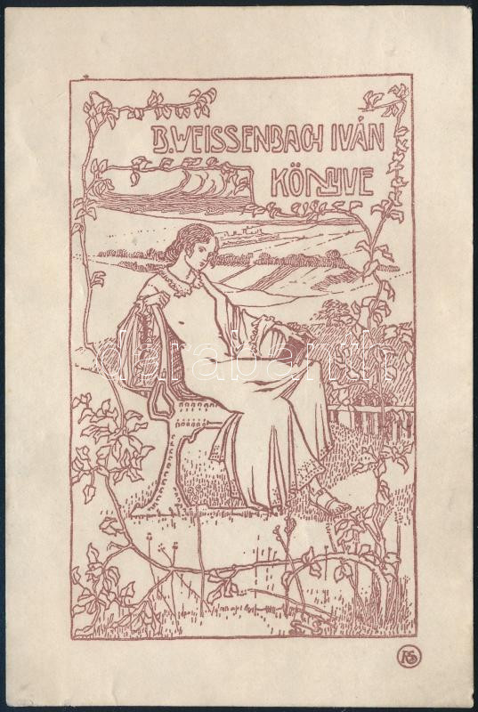 Nagy Sándor (1869-1950): B. Weissenbach Iván könyve (szecessziós ex libris). Klisényomat, papír, jelzett a nyomaton. 10x6,5 cm