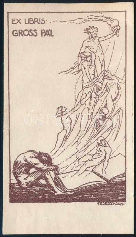 Tedesco Anna (1903-1969): Ex libris Gross Pál. Klisé, papír, jelzett a klisén, apró lapszéli szakadással, 9x5,5 cm