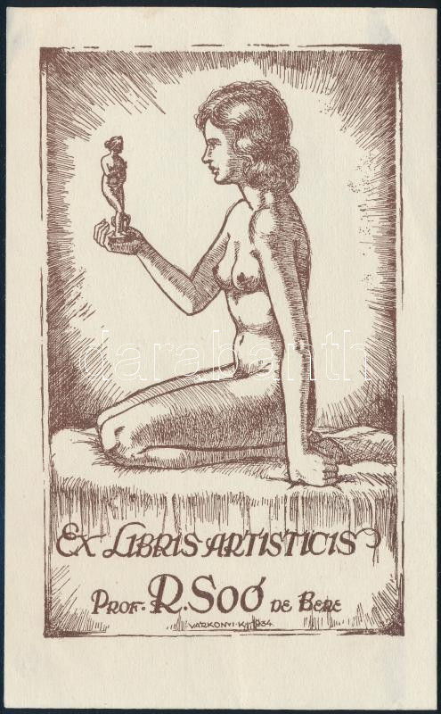 Várkonyi Károly (1910-2001): Ex libris artisticis prof. R. Soó de Bere (Prof. Dr. Berei Soó Rezső 1903-1980 botanikus számára készített erotikus ex libris), 1934. Klisé, papír, jelzett a klisén. 12x7,5 cm.