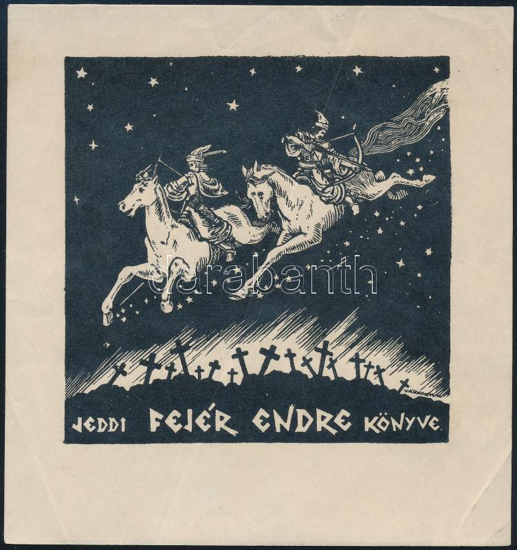 Várkonyi Károly (1910-2001): Jeddi Fejér Endre könyve (ex libris), 1936 körül. Klisé, papír, jelzett a klisén, 8x8 cm.