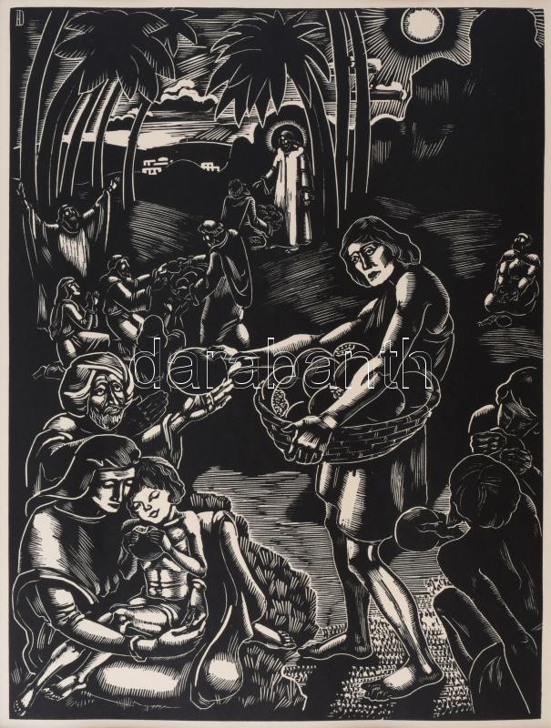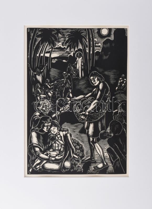 Beschreibung: Dallos Hanna (1907-1944): "Mindennapi kenyerünket", fametszet, papír, jelzett a metszeten, az 1934-ben megjelent Miatyánk c. mappából, paszpartuban, 28,5x20,5 cm