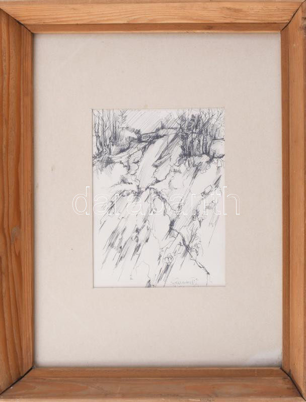 Beschreibung: Feldmann Tibor (1945-?): Tájvázlat. Tus, papír. Jelzett. Üvegezett fakeretben. 19x13,5 cm.