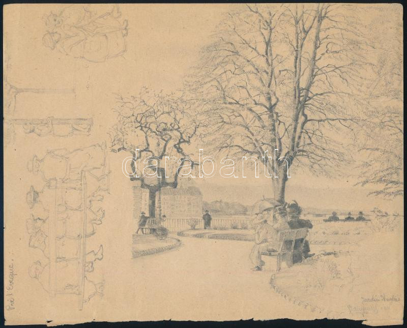 Beschreibung: Glatz Henrik (Glatz Oszkár fia): Jardin Anglais, Genf, Svájc, 1921 (tanulmányrajz). Ceruza, papír. Jelzett. 17,5×22 cm