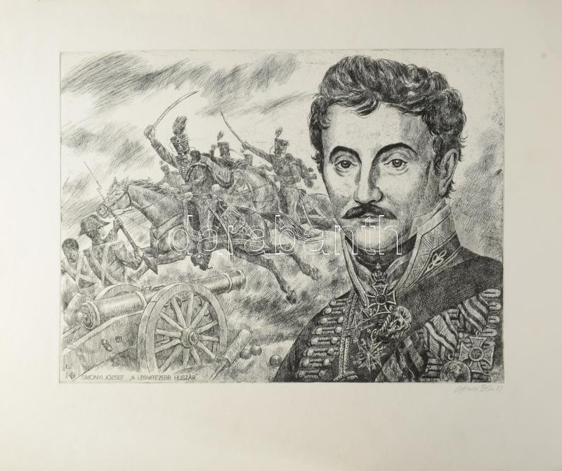 Gönczi Béla (1934-): Simonyi József, "a legvitézebb huszár", 1987. Réz... https://www.darabanth.com/de/518-Gemalde-Plakat-ex-libris-Auktion/523.0/Gemalde-und-Grafiken/Gemalde-und-Grafiken~4/Gonczi-Bela-1934-Simonyi-Jozsef-a-legvitezebb-huszar-1987-Rezkarc-papir-jelzett-29x39-cm~II3493305